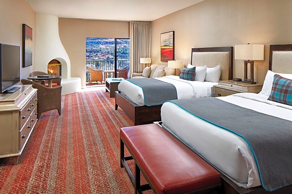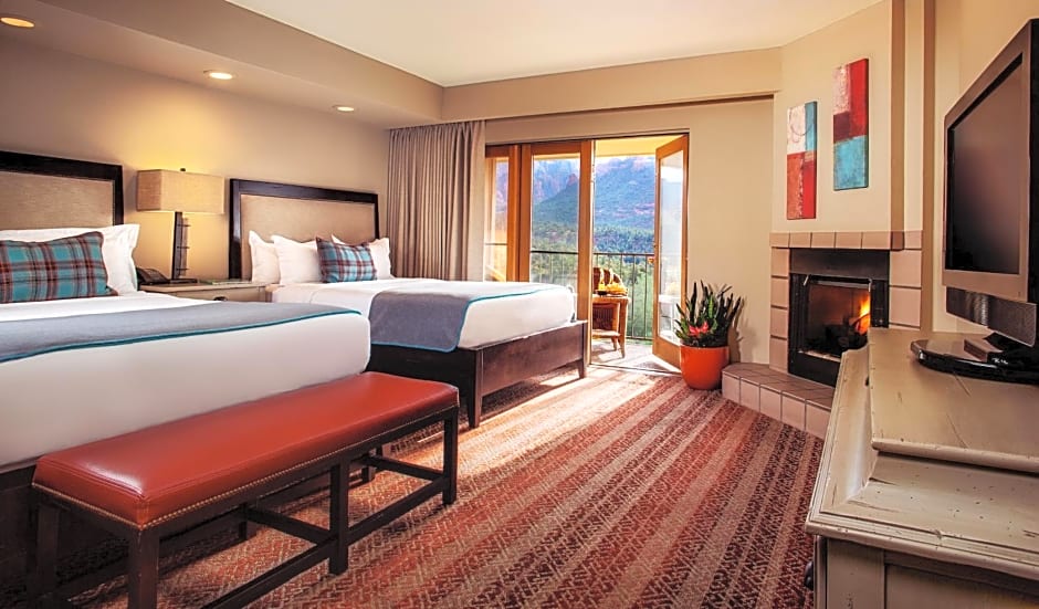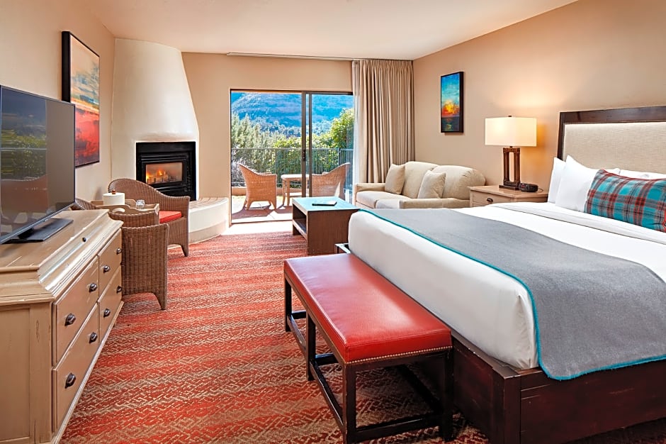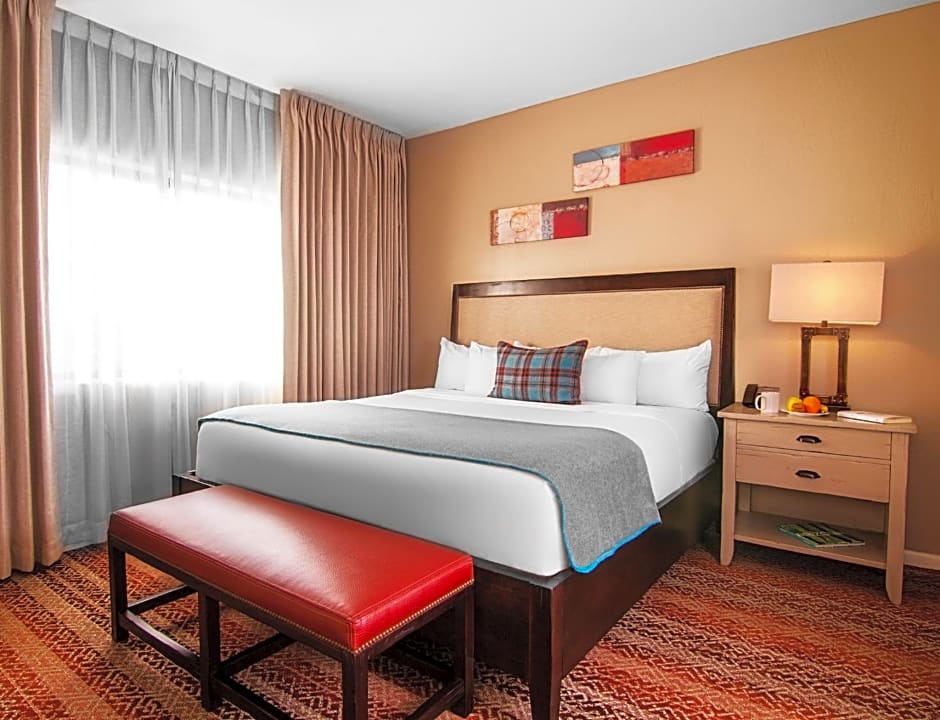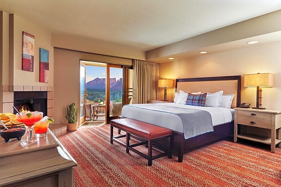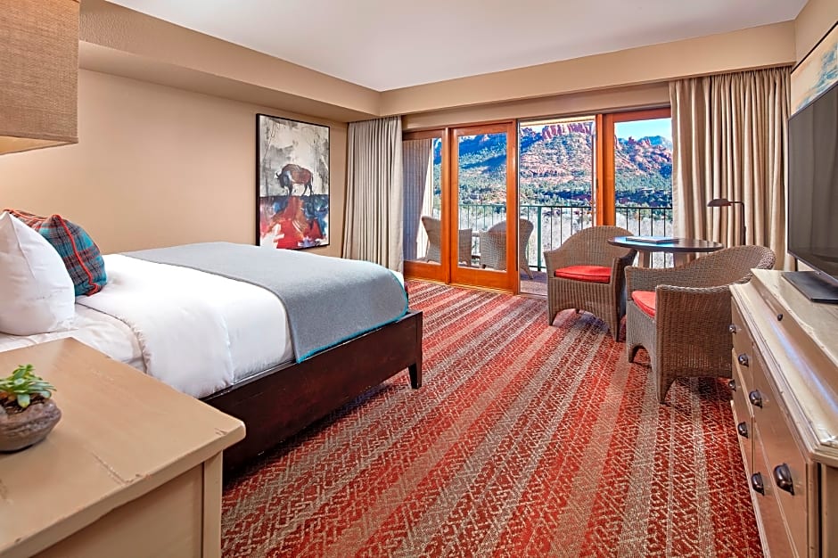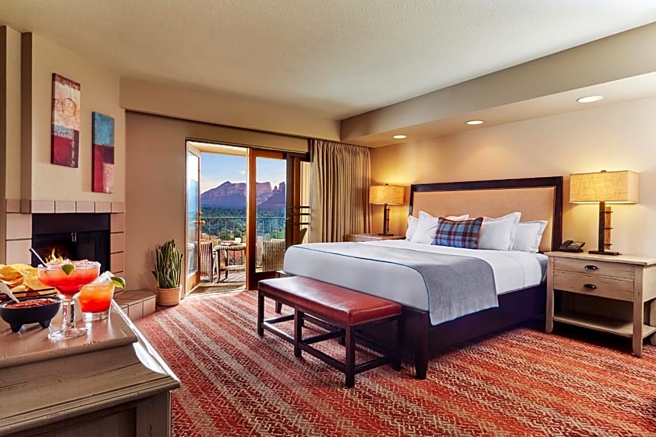 Experience luxury and breathtaking mountain views in our Red Rock Deluxe King Room. This spacious 355 sqft room features a private balcony, flat-screen TV, and a comfortable king size bed. Perfect for a romantic getaway or family vacation.