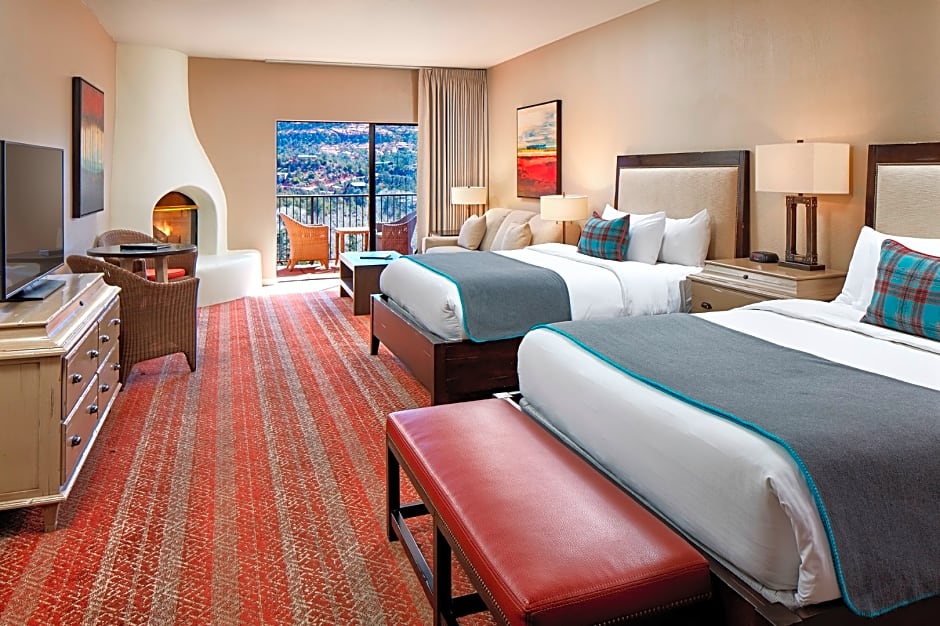 Welcome to our Red Rock Premium Two Queen Room, a spacious 355 sqft retreat perfect for families or groups of up to 4 adults and 3 children. Unwind on the balcony, enjoy the convenience of a refrigerator and tea/coffee maker, and relax by the fireplace in this smoke-free haven.
