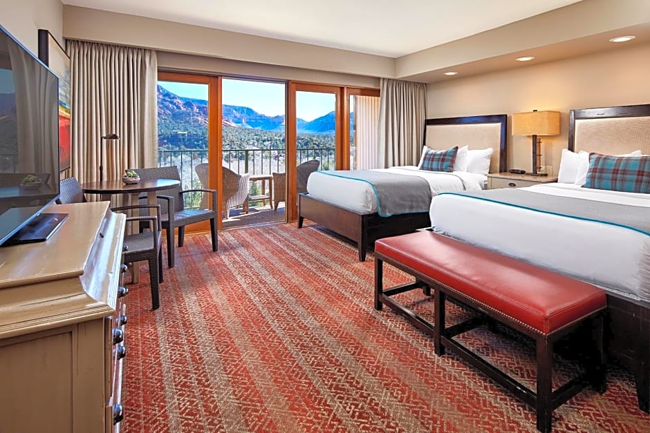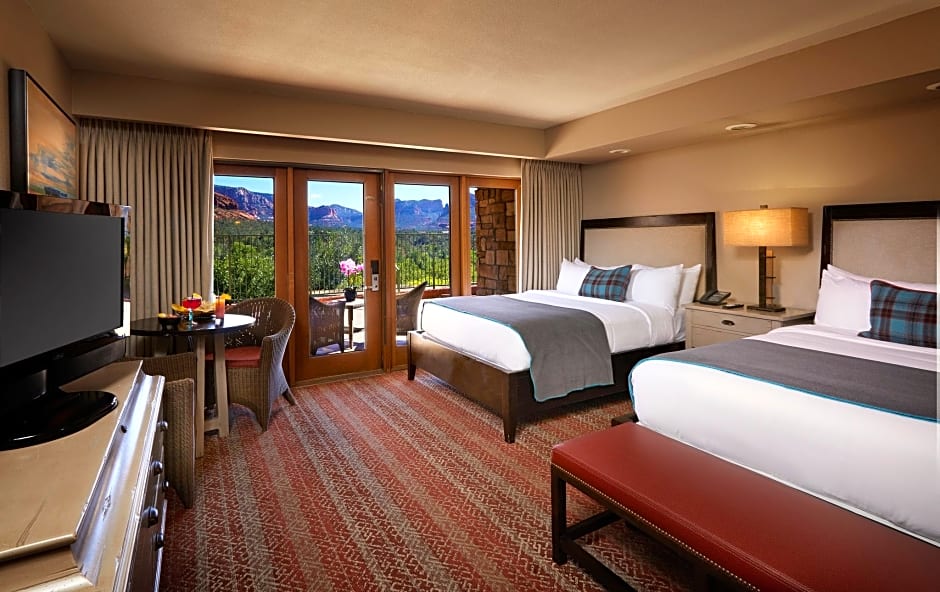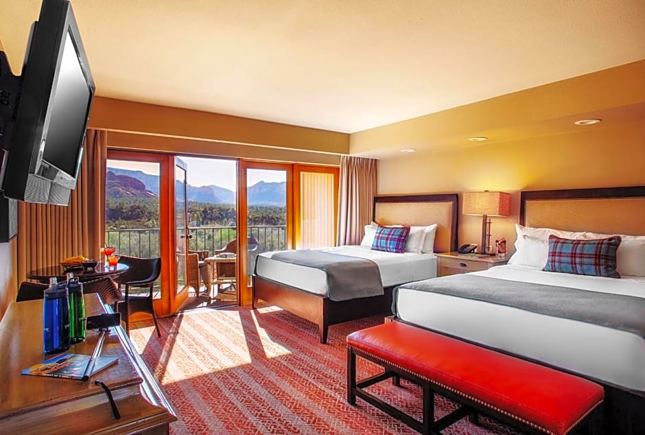 Experience the breathtaking mountain view from your private balcony in our spacious Red Rock Two Queen Room. Accommodating up to 4 adults and 3 children comfortably, this room features two Queen size beds, a coffee machine, a flat-screen TV, and more for a memorable stay.