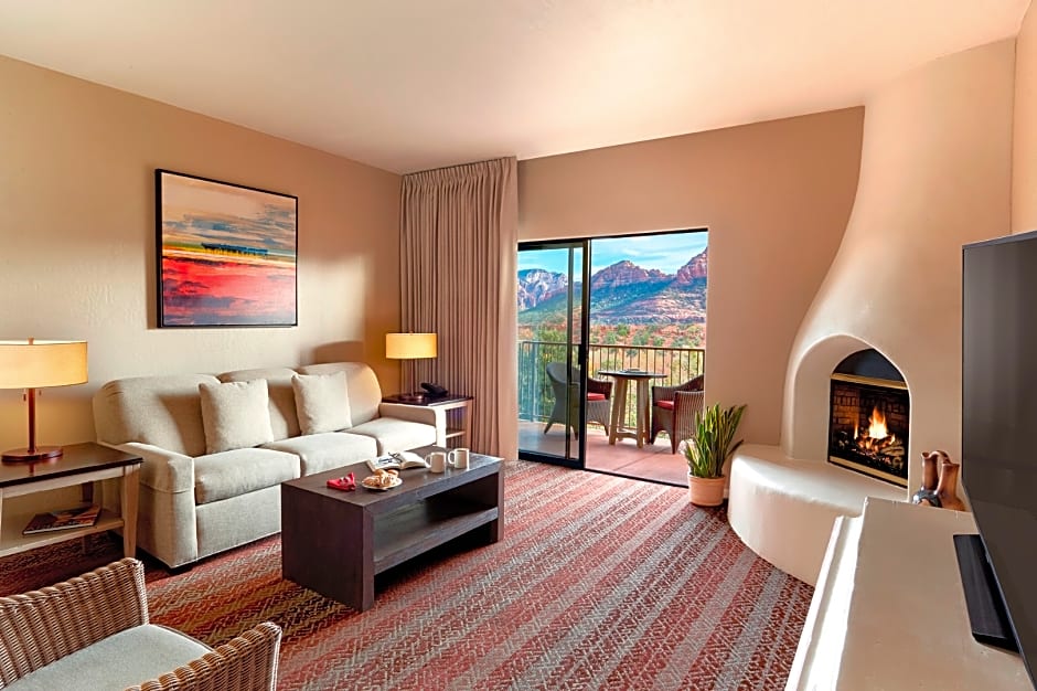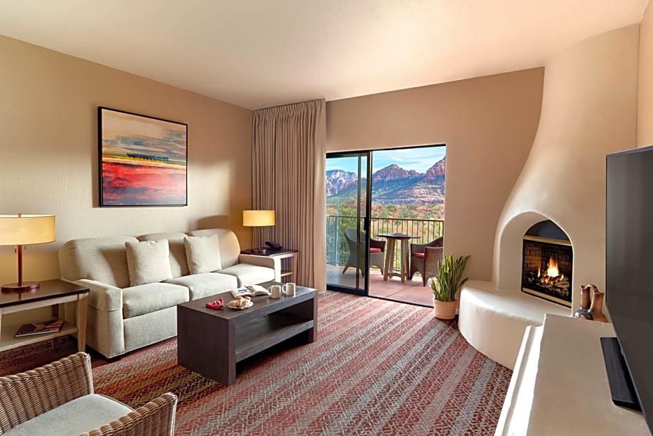 Welcome to our Red Rock Premium King 1 Bedroom Suite, a spacious and pet-friendly retreat measuring 506 sqft. This elegant suite features a balcony, a cozy fireplace, and a refrigerator, offering a perfect blend of comfort and convenience for 2 adults and 2 children. Savor a cup of tea or coffee while enjoying the breathtaking views.